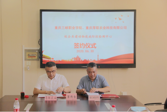 6月30日,我校与重庆厚联农业科技有限公司在行政楼202会议室,举行了校企共建动物疫病防控检测中心签约仪式。学校校长李炯光、重庆厚联农业科技有限公司董事长黎扬出席签约仪式并讲话。签约仪式由副校长张智主持。重庆厚联农业科技有限公司董事程宏权、副总经理陈云志、股东段成刚、办公室主任李新田,学校对外交流合作处负责人谭军、动物科技九游网页版·官方站入口负责人张传师参加签约仪式。
