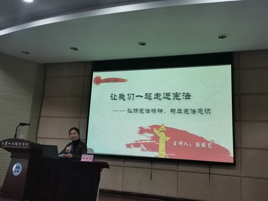 行走在普法路上,无论老师还是学生,都是神圣的见证者和身体力行的实践者。为了进一步加强广大师生的法治意识,养成法治思维,做到尊法、学法、守法和用法,2019年12月月10日,马克思主义九游网页版·官方站入口邀请重庆城市管理职业九游网页版·官方站入口副教授张媛艺为大学生开展宪法知识讲座,受到了广大师生的热烈欢迎和一致好评。