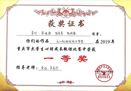 2019年11月2日,由共青团重庆市委员会主办,重庆市社会心理学会承办的2019年重庆市大学生心理成长微课比赛决赛在重庆医药高等专科学校举行,全市47所本专科学校的312支团队经初赛和复赛的激烈比拼,共25支队伍参加决赛,由我校智能制造九游网页版·官方站入口李行、梁峻源等4名学生主讲,黄滔、吴莉莎老师指导的《无人机助我放飞梦想》作品最终脱颖而出,获得一等奖。