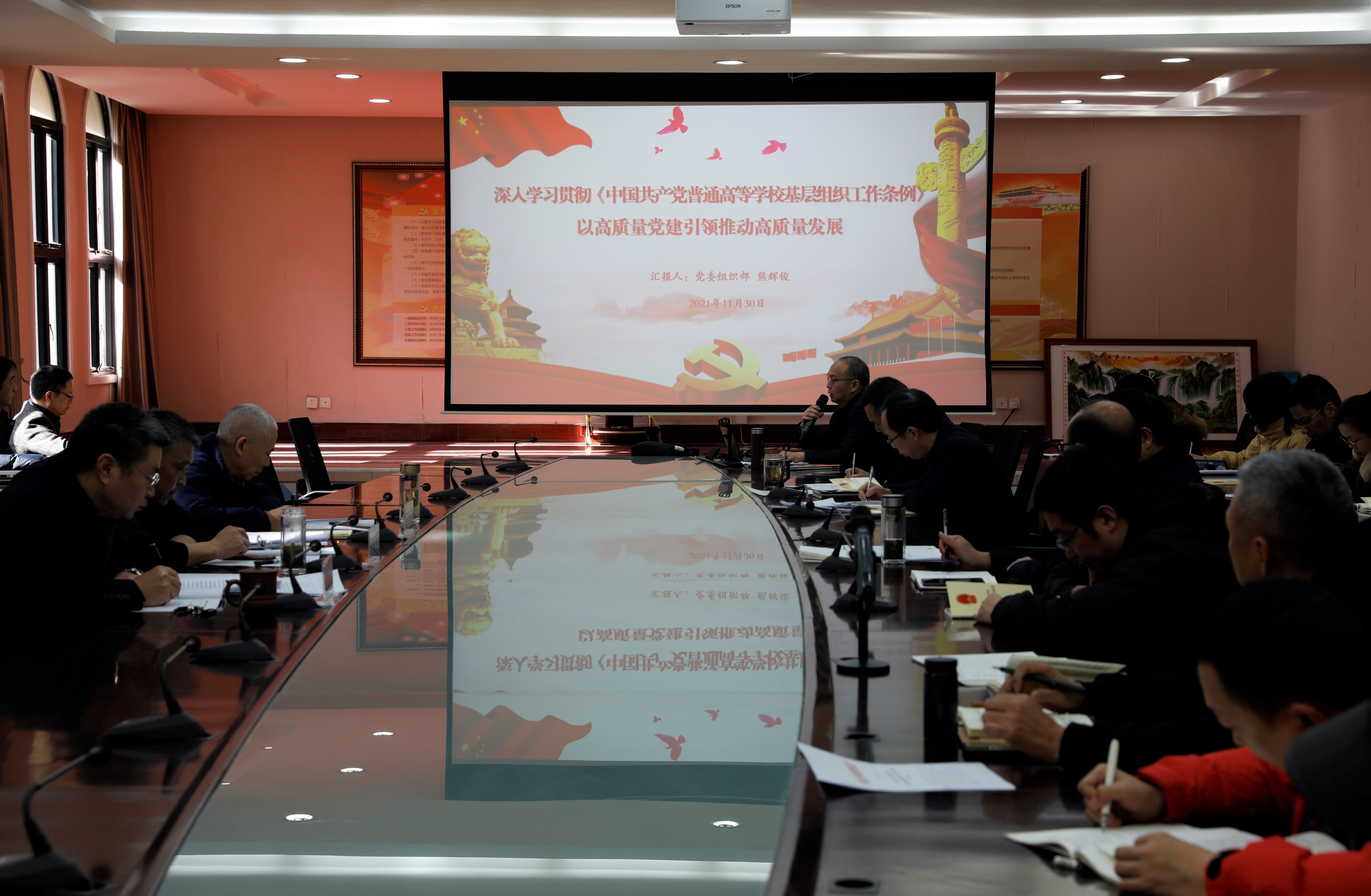 党委委员、组织部部长熊辉俊领学了《中国共产党章程》、《中国共产党组织工作条例》、《中国共产党普通高等学校基层组织工作条例》、《重庆市贯彻〈中国共产党普通高等学校基层组织工作条例〉重点措施》、《重庆市教育系统党的建设五年行动计划(2021-2025)》等有关内容,重点解读了《中国共产党普通高等学校基层组织工作条例》。他表示,学习好相关内容是贯彻新时代党的建设总要求和新时代党的组织路线,要以党的政治建设为统领,高质量高标准开展党建规范化标准化建设,以高度的政治忠诚、政治定力、政治担当,促进党建与中心工作深度融合,推动九游网页版·官方站入口党的建设全面提质增效。