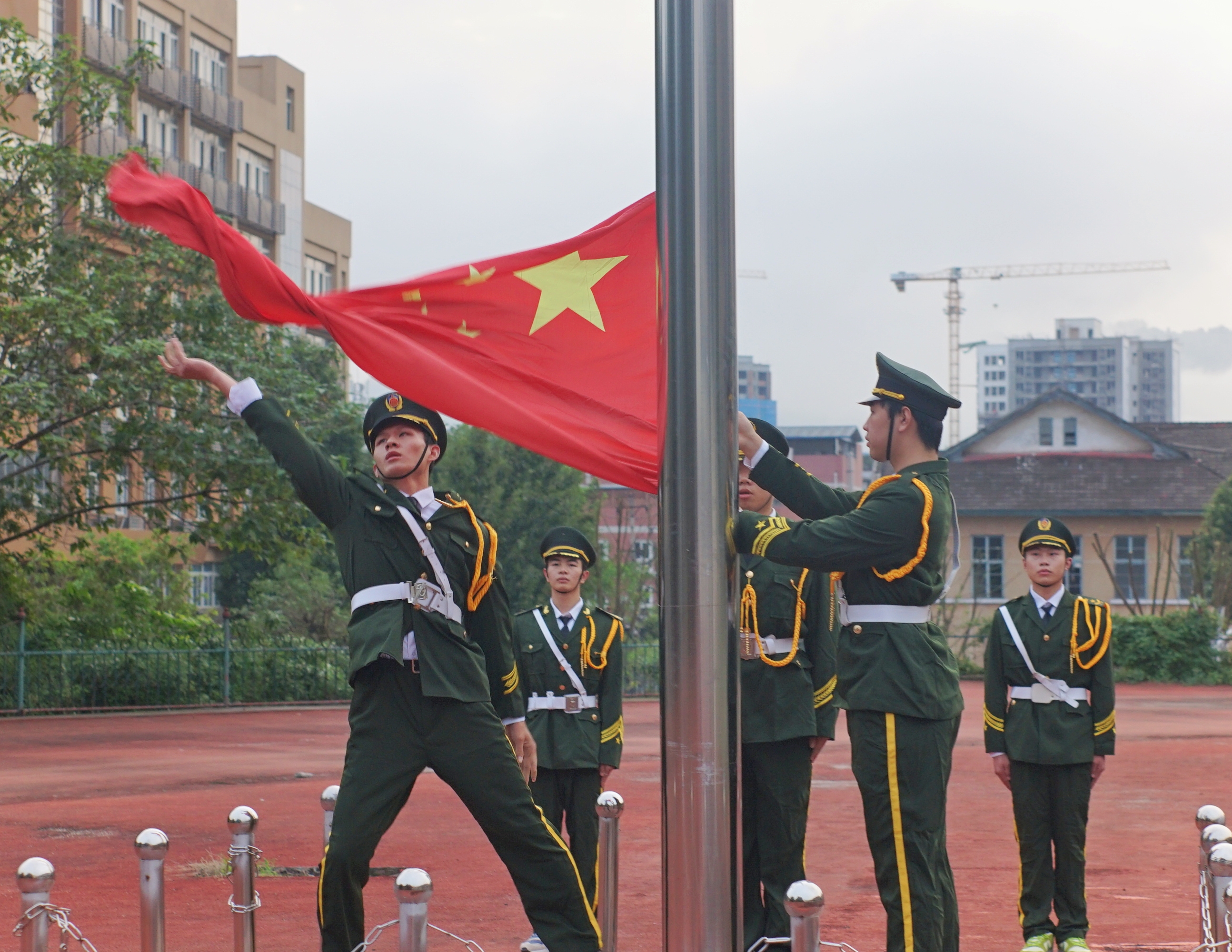 旭日初升,微风徐徐,升旗仪式正式开始。全体师生高唱国歌,国旗护卫队在雄壮激昂的国歌声中将鲜艳的五星红旗冉冉升起。全体师生面向国旗肃立,满怀着崇高的敬意向革命先烈默哀。