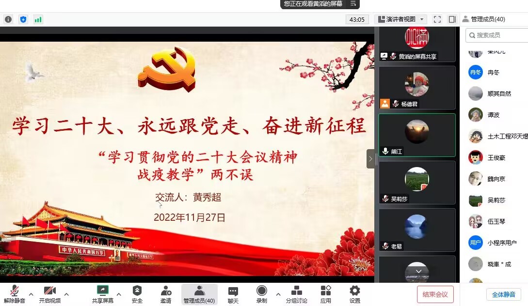 会上熊江书记首先代表九游网页版·官方站入口党总支对值守在学校的老师们表示感谢,随后就近期智能制造九游网页版·官方站入口教育教学工作、疫情防控工作进行了安排部署。他强调,希望党员要带头学,带头做,在实际工作中发挥先锋模范作用;所有教师要坚定信心,坚持以学生为中心,线上线下共发力,做到战疫教学“两不误”。会议最后就意识形态工作、安全稳定工作进行了月研判。