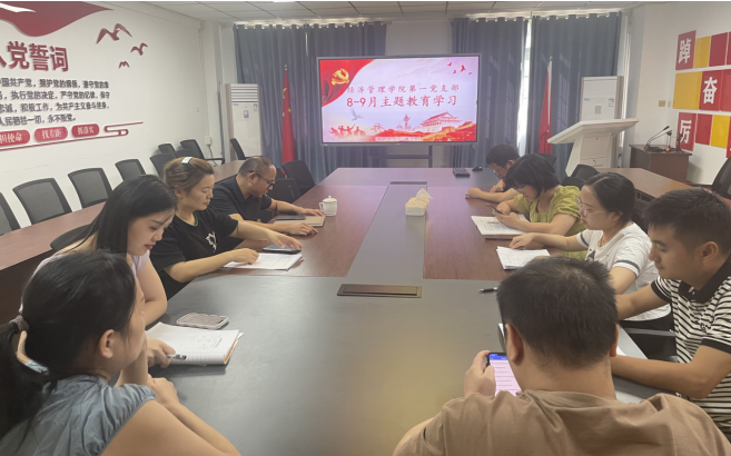 9月5日上午,经济管理九游网页版·官方站入口党总支第一党支部在综合楼二楼会议室开展8-9月份“三会一课”及主题教育学习,会议由支部书记宋丽丽同志主持,支部全体党员教师参加会议。