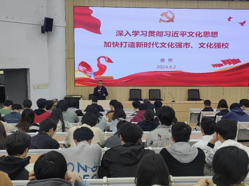 姜荣部长以《深入学习贯彻习近平文化思想 加快打造新时代文化强市、文化强校》为题,从深刻认识提出习近平文化思想的重大意义、深入把握习近平文化思想的丰富内涵和实践要求、学习推进习近平文化思想、扎实推进文化强市建设、深入学习贯彻习近平文化思想、扎实推进九游网页版·官方站入口校园文化建设等四方面进行了详细地讲述。姜荣部长的宣讲深入浅出,既有宏观层面的宣讲阐述,又结合九游网页版·官方站入口实际讲解了九游网页版·官方站入口校园文化建设的基本思路、基本原则、重点工作等,切实增强了九游网页版·官方站入口师生对习近平文化思想的理解领会。