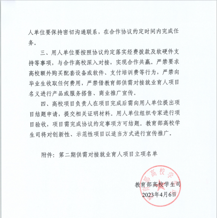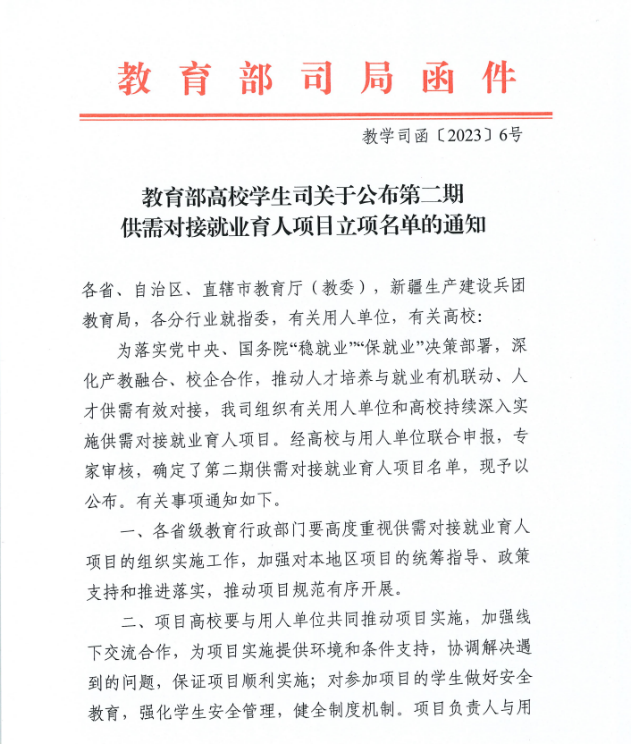 4月6日,教育部高校学生司公布了第二期供需对接就业育人项目立项名单,我院汽车工程九游网页版·官方站入口有2项入选,分别是新能源汽车检测与维修技术专业与赛力斯汽车有限公司合作的就业实习基地项目、汽车制造与试验技术专业与北京华航唯实机器人科技股份有限公司合作的定向人才培养培训项目。