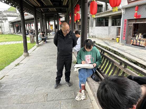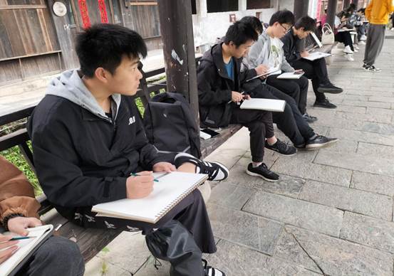 同学们在指导老师的带领下,深入乡村生活,感受诗情画意的山水风情,体会淳朴厚重的徽派文化,在发掘创作素材的同时提升自身观察能力和审美能力。在写生环节中,同学们逐渐认识到,写生并不是单纯意义上的对大自然的一种拷贝,写生也需要我们去思考,从选景到构图,再到颜色,甚至笔法,都需要去仔细推敲。普通意义上的写生或许是绘画语言的推敲,或借此搜集创作素材,但作为艺术作品意义上的写生就不应只是简单的对自然的模仿,它是一种超越或者再创造。