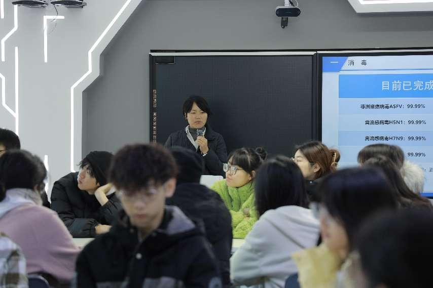 重庆市畜牧科九游网页版·官方站入口生物工程研究所所副所长丁玉春,长期从事临床兽医、养猪技术研究、猪场生产管理和技术服务以及模式动物研究与推广等工作。本次讲座以《让非洲猪瘟和呼吸道疾病综合征远离猪场》为题,为同学们讲解了非洲猪瘟和呼吸道疾病的特征以及如何避免。