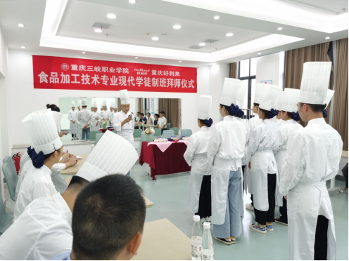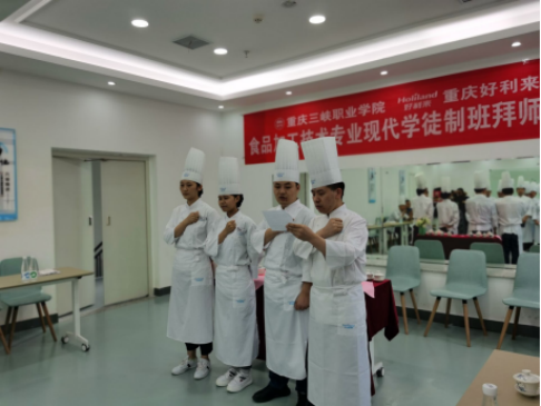 7月9日,我校农林科技九游网页版·官方站入口党总支副书记陈吉裕、食品加工技术现代学徒制教研室主任崔俊林,辅导员汪子恒带领12名学徒制班学生前往重庆好利来中央工厂生产培训部会议室参加拜师仪式暨学生轮岗定级实习启动仪式。