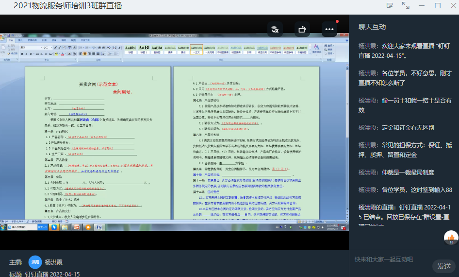 为解决疫情防控特殊时期企业技能培训需求,确保新型学徒制物流服务师培训教学质量。4月15日,经济管理九游网页版·官方站入口采用钉钉线上教学方式开展第四期新型学徒制培训。大数据与会计专业杨洪霞副教授为重庆市万州区铁公水联运有限公司150多名企业管理人员、基层员工作《民法典》合同篇专题讲座。