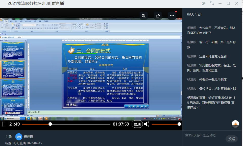 合同制度是市场经济的基本法律制度,《民法典》合同编分为三个分编29章,杨洪霞老师从法律规定出发,结合案例,对“劳动合同当事人、劳动合同的订立与生效、劳动合同的有效与无效、劳动合同期限、试用期、服务期、劳动合同的解除与终止、经济补偿金”等问题进行了详细讲解,并对学员进行了《买卖合同》线上实操指导。