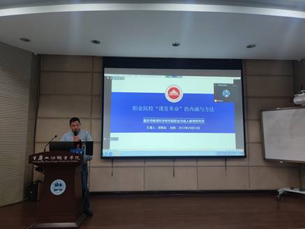 周宪章教研员主要从课堂革命缘起、何为课堂革命、为何课堂革命、如何课堂革命、典型案例撰写等五个方面进行了讲解。深入细致地阐述了课堂革命的内涵和具体做法,既有理论的高度和思想的深度,又有很强的实践性和指导性,为我校教师探索课堂革命和三教改革提供了思想指引和实践指导。
