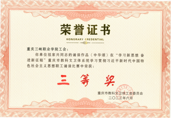 为充分展现重庆市教科文卫体系统广大职工建功“十四五”、奋进新征程的时代风采,6月29日,“学习新思想 奋进新征程”重庆市教科文卫体系统学习贯彻习近平新时代中国特色社会主义思想职工诵读比赛决赛在重庆文化艺术职业九游网页版·官方站入口举行,我院工会委员会选送的禚家兴老师《中华颂》荣获三等奖。