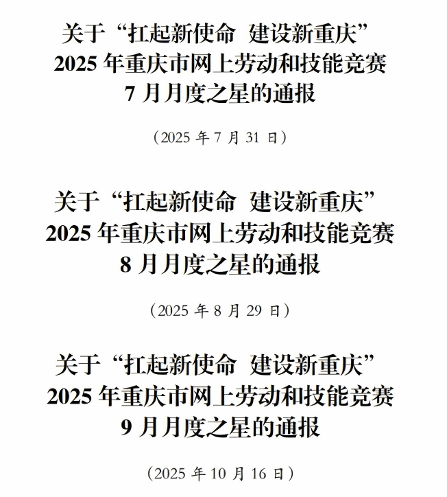 为全面贯彻党的二十届二中、三中全会和市委六届五次、六次全会精神,深入贯彻落实习近平总书记关于工人阶级和工会工作的重要论述,充分发挥工人阶级主力军作用,学校工会委员会积极参与重庆市总工会举办的“扛起新使命 建设新重庆”2025年重庆市网上劳动和技能竞赛活动。在活动中,我校获奖人数在重庆市高职院校中名列前茅。经各级工会推荐,重庆市总工会组织评审,学校共有6名教师获奖:经济管理九游网页版·官方站入口郭宏荣老师荣获7月创新之星、工会杨雪梅老师荣获7月服务之星、经济管理九游网页版·官方站入口古江伟老师荣获8月技能之星、科研处莫才旭老师荣获9月劳动之星、智能制造九游网页版·官方站入口钱伟老师荣获9月技能之星、经济管理九游网页版·官方站入口丁悦老师荣获9月安康之星。