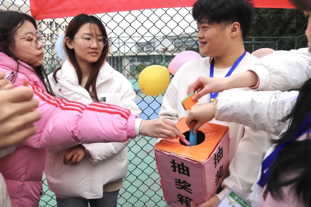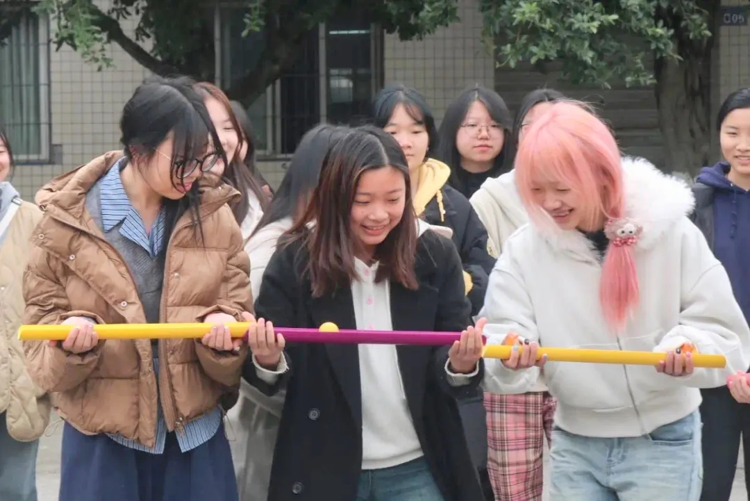 活动当天,阳光明媚,春风和煦。活动现场人声鼎沸,欢声笑语不断。一系列精心设计的游戏环节让整个活动充满了趣味性和参与感。在“你比我猜”游戏中,同学们展现了出色的默契与团队协作能力,猜词者的机智反应和比划者的夸张动作引发了阵阵欢笑。保卫气球游戏则考验了同学们的配合程度与灵活应变,紧张刺激的比赛过程让围观的同学们欢呼不已。珠行千里游戏更是将团队合作与智慧挑战完美结合,同学们小心翼翼、屏息凝视地传递乒乓球,现场气氛紧张而热烈。