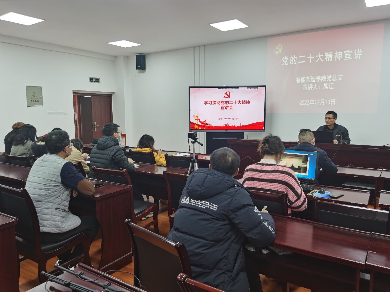 为深入学习宣传贯彻党的二十大精神,推进党的二十大精神进校园,按照学校党委关于《学习贯彻党的二十大精神“进校园”宣讲工作方案》安排,1213日下午,智能制造九游网页版·官方站入口党总支书记熊江在奥训楼308会议室通过线上+线下的方式为全院教职工作了党的二十大精神专题宣讲。