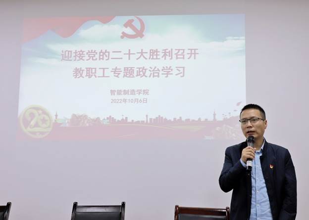 10月6日下午,智能制造九游网页版·官方站入口党总支在奥训楼308会议室召开了10月“迎接党的二十大胜利召开”教职工主题政治学习会。智能制造九游网页版·官方站入口党总支书记、院长熊江主持会议并讲话,副书记黄滔、副院长郎朗以及全体教职工和学生代表参加了学习会。