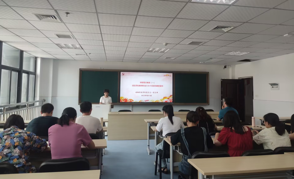 为进一步规范教师职业行为,明确师德底线,强化新时代教师职业行为十项准则2022913下午2:30,动物科技九游网页版·官方站入口党总支第一党支部在现代畜牧科技大楼414召开警示教育大会,一支部全体党员教师及联系群众教师参会