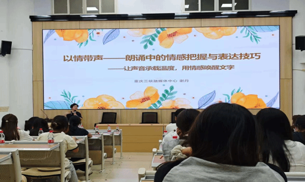 为深入贯彻第28届全国推广普通话宣传周“加大国家通用语言文字推广力度,突出铸牢中华民族共同体意识”主题,提升我校学生的语言文化素养与语言表达能力,营造“说普通话、用规范字”的良好校园语言环境,9月23日,通识教育九游网页版·官方站入口特邀重庆三峡融媒体中心主任播音员、重庆市播音主持协会理事、重庆市十佳播音员主持人、万州区第六届政协委员谢丹老师,在信科楼220教室带来题为《以情带声——朗诵中的情感把握与表达技巧》的专题讲座,吸引了一百余名朗诵爱好者踊跃参与。通识教育九游网页版·官方站入口党支部副书记、副院长潘雪主持本次讲座。