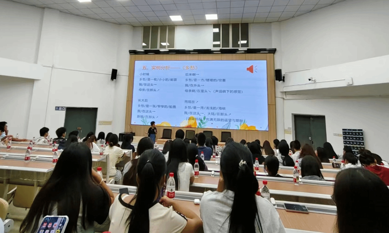 实例分析环节,谢丹老师通过《乡愁》与《春》的对比讲解,剖析了文本意象与情感表达要点,并邀请学生上台展示,从多维度进行点评,帮助学生直观掌握“以情带声”的实践技巧。