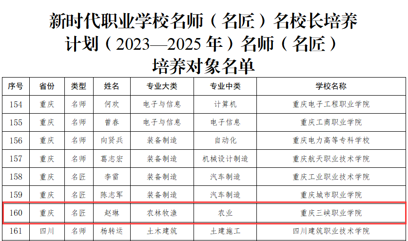为深入贯彻党的二十大精神,落实中共中央办公厅、国务院办公厅《关于深化现代职业教育体系建设改革的意见》有关要求,近日,教育部公布了新时代职业学校名师(名匠)名校长培养计划(2023—2025 年)培养对象名单,我院党总支书记、院长赵琳教授入选新时代职业学校名师(名匠)培养名单。据了解,本次全国共有210人入选,其中重庆市入选7人。
