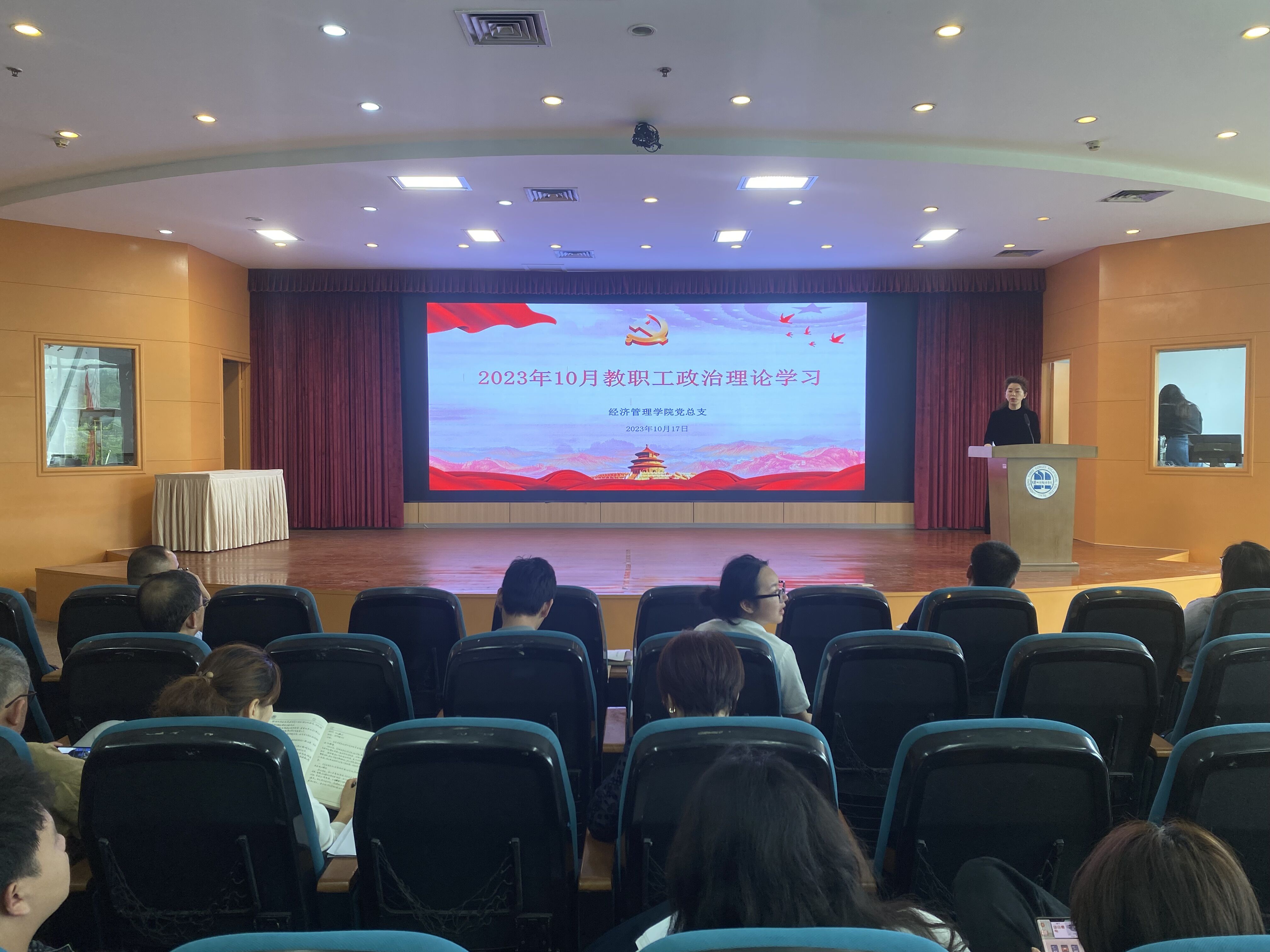 10月17日下午,经济管理九游网页版·官方站入口在沙龙校区综合楼2楼学术报告厅召开10月政治理论学习和师德师风警示教育会,全体教职工50余人参加本次会议。