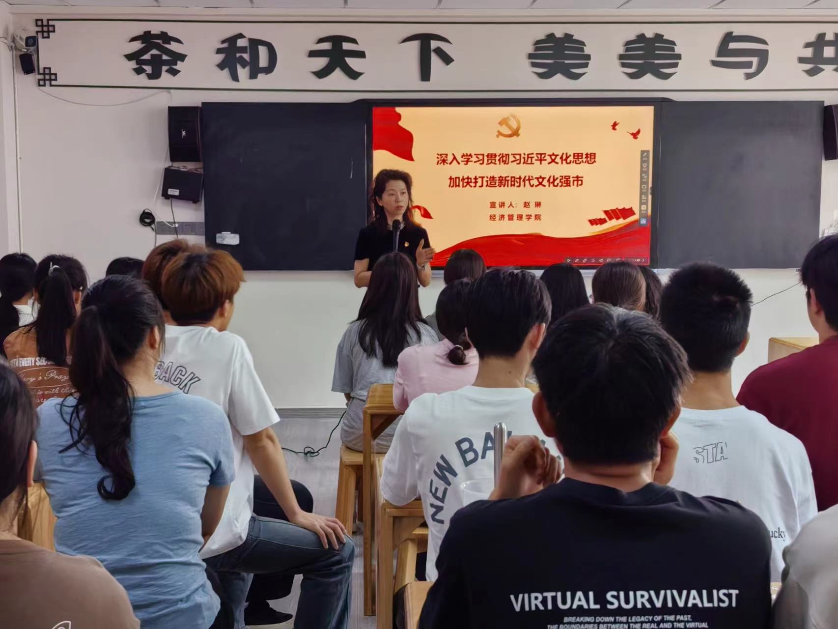 为深入学习贯彻落实党的二十大精神和全国宣传思想文化工作会议精神,5月17日,经济管理九游网页版·官方站入口在沙龙校区茶艺实训室开展《深入学习贯彻习近平文化思想 加快打造新时代文化强市》专题宣讲,宣讲由经济管理九游网页版·官方站入口党总支书记、院长赵琳主讲。经济管理九游网页版·官方站入口教师代表、学生代表共计100余人参加了宣讲会。