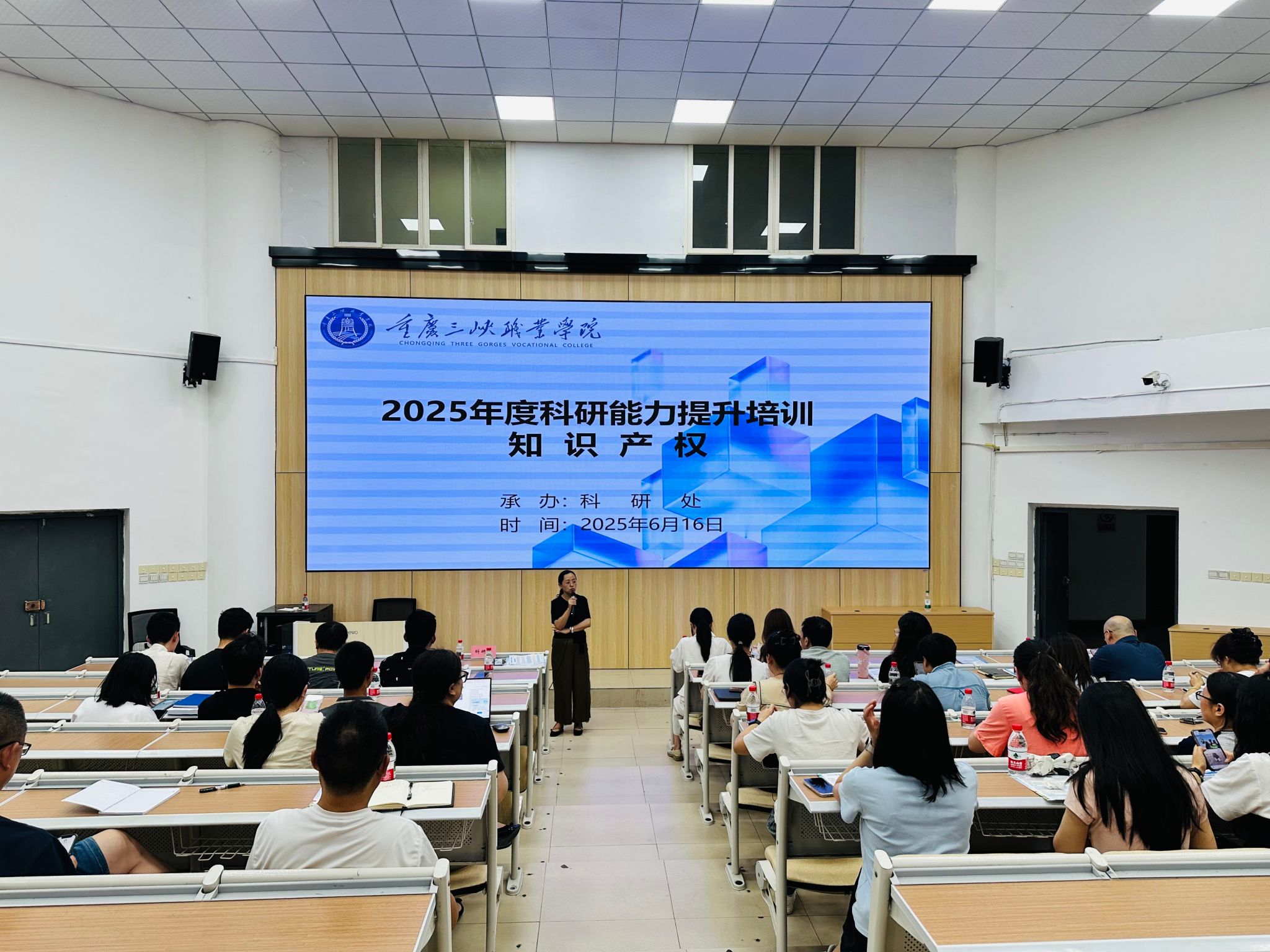 2025年6月16日,科研处在信科楼220举办年度科研能力提升培训,特邀重庆西南知识产权运营集团专家杨雪开展专利挖掘及转化运用培训。全校科研骨干及教师代表100余人参会,科研处处长聂青玉主持会议。