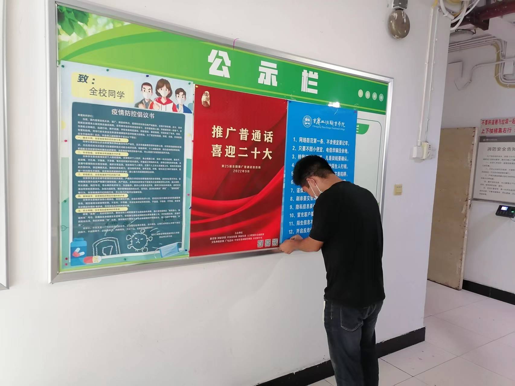 最后编写《2022年秋季开学第一节课安全教育资料》提供各二级九游网页版·官方站入口、各班级组织开展线上开学第一课的安全学习教育。通过QQ、学校微信公众号等平台发布开学季防骗反诈、反邪教、反恐防暴等安全宣传资料,督促各班级开展线上主题班会并形成简报150余份。做好两校区开学季安全宣传工作,挂出安全横幅5幅,展出安全宣传展板8块,张贴防骗反诈宣传海报20余张,在学校LED屏滚动播放反邪反恐等安全宣传知识,发放防骗反邪反恐宣传资料500余份。