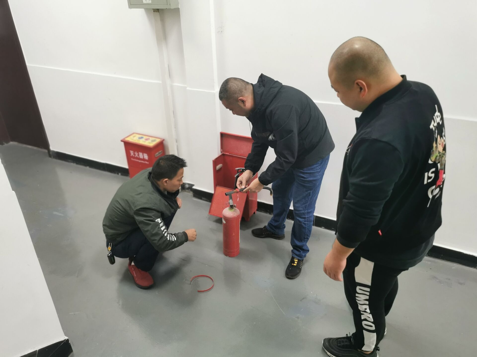 一次灭火器实操,对后勤维修管理人员、食堂管理人员、两个食堂工作人员、学生公寓宿管纪安员进行消防安全知识培训,并组织参与了灭火器实操油盆灭火。