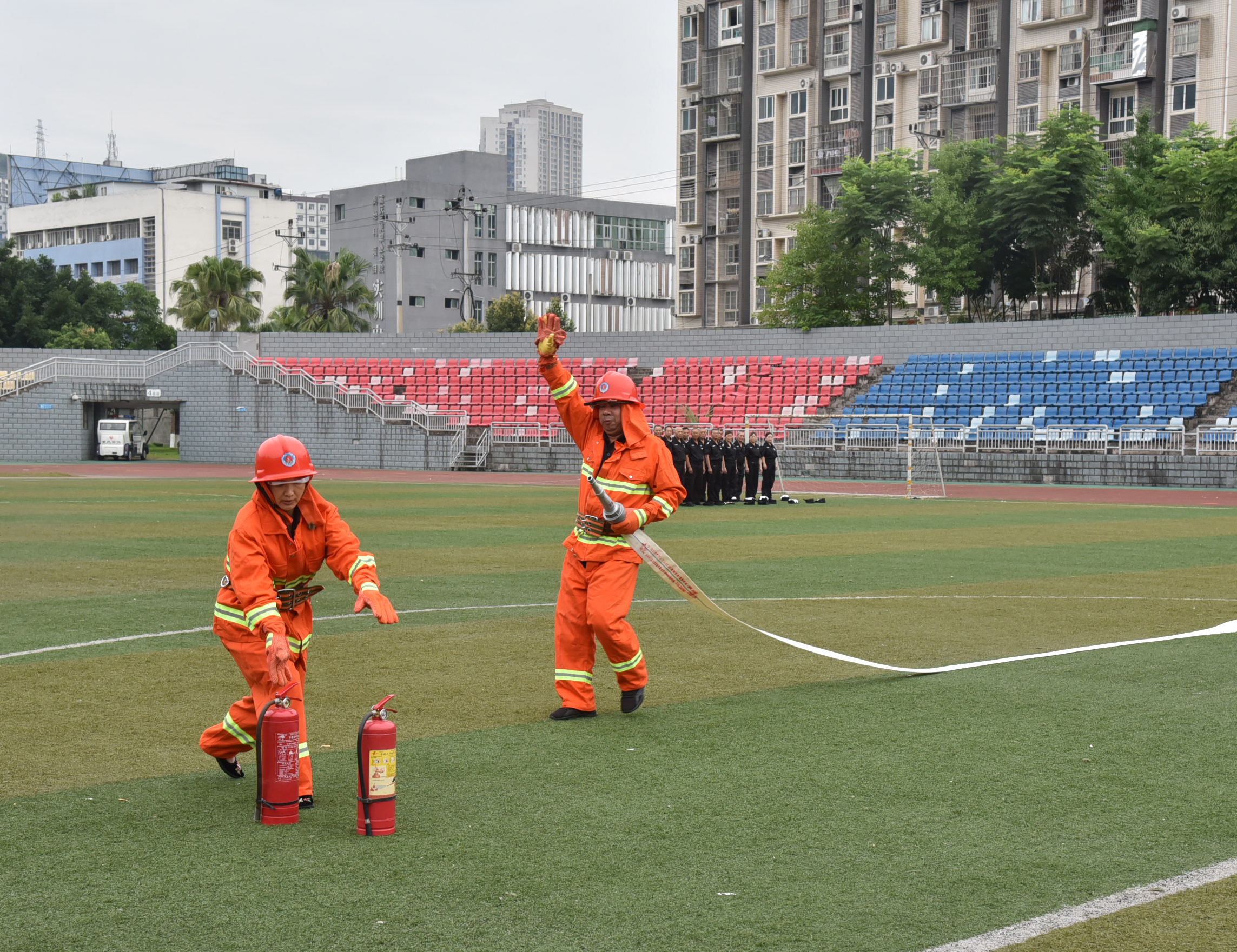二是消防实操技能。通过穿戴消防服、连接消防水带水枪、使用灭火器等接力项目,较好地展现了保安队伍的凝聚力。