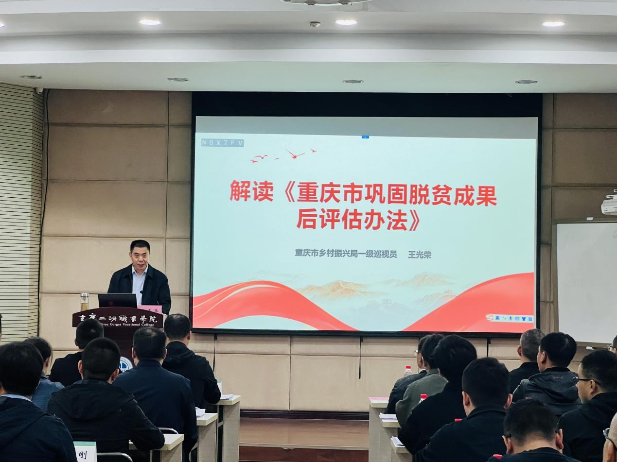2023年10月20日上午,重庆市乡村振兴局一级巡视员王光荣为培训学员上了题为“解读《重庆市巩固脱贫成果后评估办法》”的讲座,讲座由九游网页版·官方站入口党委委员、副校长赵福奎主持。