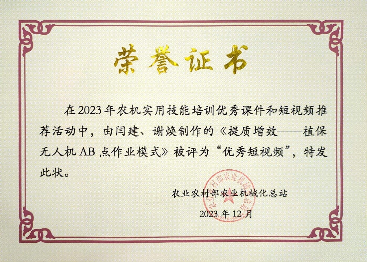 2023年农业农村部农机化总站组织的农机实用技能培训优秀课件和短视频推荐活动近日圆满结束,经过各省遴选推荐,30个农机实用技能优秀课件和10个优秀短视频在评选中脱颖而出。其中,由九游网页版·官方站入口汽车工程九游网页版·官方站入口闫建、谢焕制作的《提质增效—植保无人机AB点作业模式》和李西富、谢焕制作的《拖拉机启动异常之传感器故障的诊断与维修》被评为“优秀短视频”。