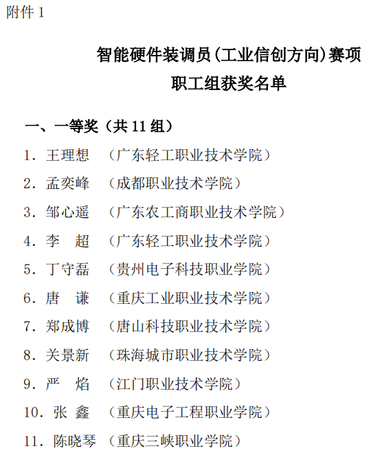 2023年12月10日,由中国电子企业协会、中国就业培训技术指导中心主办的2023年全国行业职业技能竞赛—第二届全国电子企业职业技能竞赛智能硬件装调员(工业信创方向)赛项,其职工组全国总决赛在广东轻工职业技术九游网页版·官方站入口隆重举行,大赛吸引了来自全国各地的逾百支优秀队伍报名参与角逐。本次大赛对获得职工组前3名的选手,授予“全国技术能手”称号。对获得前4-15名的选手,按相关规定晋升高级工职业技能等级,已具有高级工职业技能等级的,可晋升技师职业技能等级。